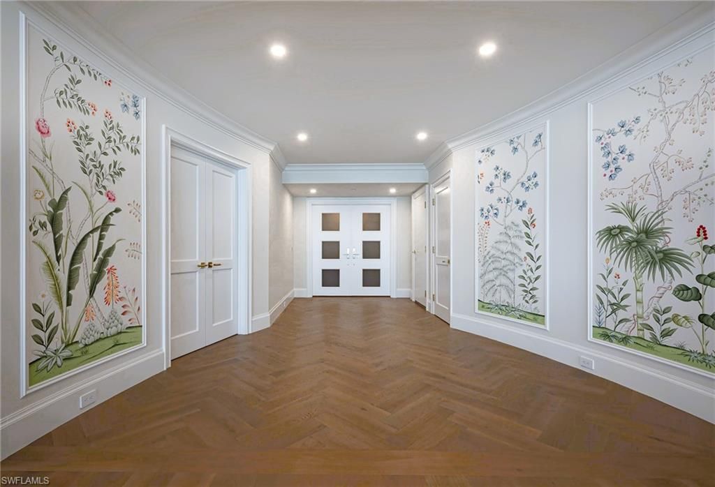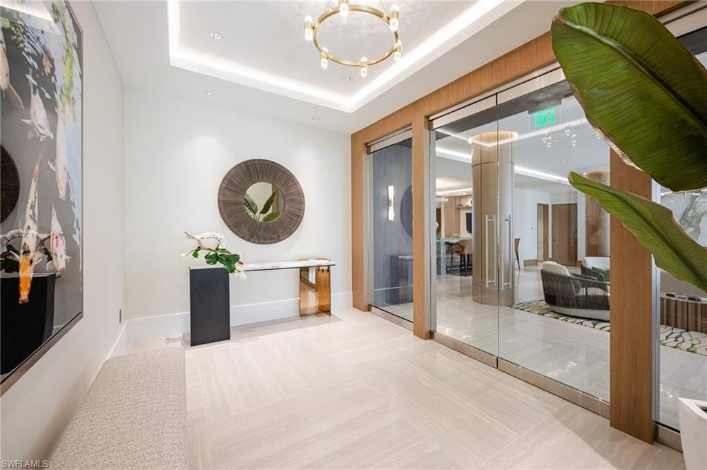 A rare offering at The Enclave, where prestigious beachfront living has been reimagined, this just completed 2025 renovation showcases panoramic views of the Gulf, Bay, and city skyline and epitomizes modern coastal sophistication. Spanning over 6,300 square feet under air, the 4-bedroom plus den residence with a bonus room features herringbone wood flooring, Calacatta Gold quartz surfaces, and bespoke designer finishes throughout. The gourmet kitchen, featuring Miele appliances and dual Sub Zero refrigerators, serves as a stunning centerpiece for entertaining, complemented by open living spaces with a welcoming fireplace and a dining area with a wet bar complete with a Miele wine cooler and dual beverage drawers, perfect for gathering with family and friends. This unit includes an oversized 2-plus car garage. There are two lanais, one off the primary bedroom and a larger lanai off the living room and dining room, which features 180-degree north and south views from the building’s first position on the beach. The larger lanai includes an outdoor kitchen setup, prewired and preplumbed for convenience, new glass railings, and the perfect vantage point for Gulf breezes and sunsets. Each guest suite is spacious and en suite with ample closet space. Additional features include a secure private elevator opening directly into the residence, gated entry, a den or home office with fireplace, zoned HVAC, electric hurricane shutters, and generous storage. Custom furnishings in luxurious fabrics and trims add to the residence’s curated elegance, resulting in a timeless and refined design. The Enclave offers one of Naples’ most exclusive beachfront lifestyles, with only one residence per floor and a soon to be completed total renovation of the public areas including a state-of-the-art fitness facility, a modernized social room, and a pool renovation with new deck and pavilion. A hurricane-resistant lobby and completely redesigned entry will arguably make The Enclave the best on the beach upon completion in 2026. Residents may also lease or purchase a boat slip at the Venetian Yacht Club.